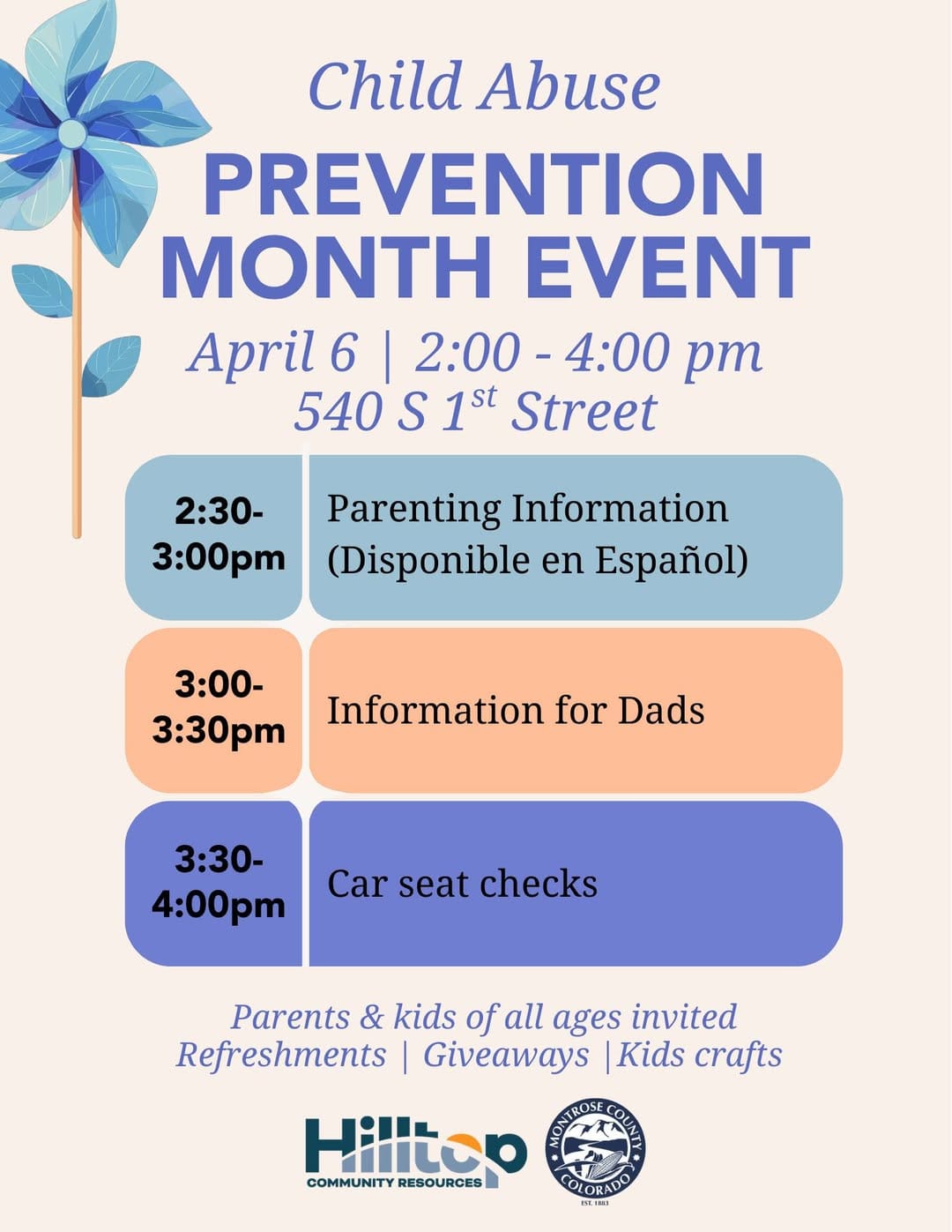 The county will kick off its events on April 6 at 2 p.m. with a preschool-focused gathering at Hilltop, located at 540 S. 1st Street in Montrose. The event is designed for young children and their caregivers, with crafts and story time alongside practical support for parents. Families will have access to a Love & Logic parenting session, a fatherhood-focused discussion, and free car seat inspections. A diaper raffle and additional giveaways will also be available.