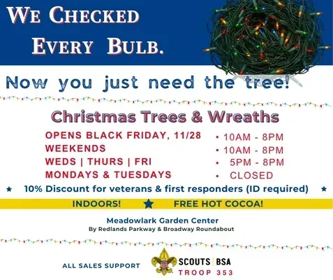 📍 Meadowlark Garden Center, 2259 S Broadway, Grand Junction Support local scouts and bring home a real Christmas tree or wreath. All proceeds benefit BSA Troop 353.