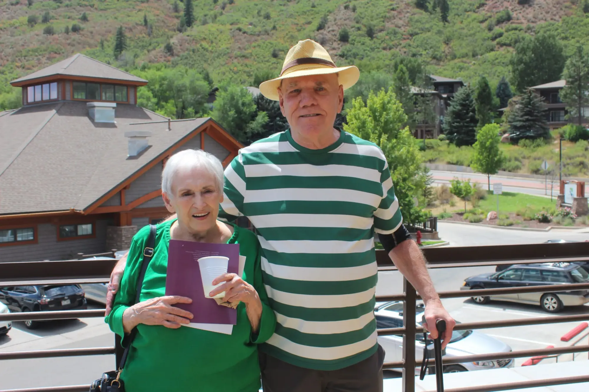 Glenwood Springs residents Monte Nostrom, right, and his wife Elaine Nostrom, stand on a balcony at the new Benedict Apartments during a ribbon cutting ceremony on Aug. 7. The couple decided to apply for one of the new units after finding out their rent was going to increase by about $1,200 a month. Credit: Eleanor Bennett/Aspen Journalism & Aspen Public Radio